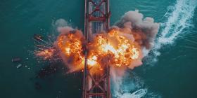 Dramatic Bridge Explosion: Aerial View of Fire and Smoke Engulfing a Metal Bridge, with Debris Scattering into the Disturbed Water Below