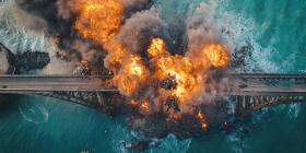 Dramatic Bridge Explosion: Aerial View of Fire and Smoke Engulfing a Metal Bridge, with Debris Scattering into the Disturbed Water Below