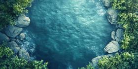 Serene Coastal Paradise: Clear Turquoise Water, Rocky Cliffs, and Sandy Beach with Lush Green Vegetation