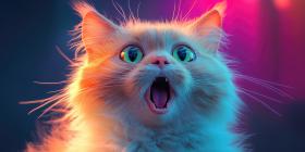 Surprised Cat in Vibrant Lighting: Fluffy Feline with Bright Green Eyes Illuminated by Shades of Blue, Orange, and Pink