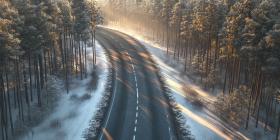Tranquil Winter Road through Misty Forest: Bare Trees, Snow-Covered Ground, and Golden Sunlight Creating an Ethereal Atmosphere