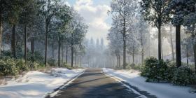 Tranquil Winter Road through Misty Forest: Bare Trees, Snow-Covered Ground, and Golden Sunlight Creating an Ethereal Atmosphere