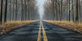 Tranquil Winter Road through Misty Forest: Bare Trees, Snow-Covered Ground, and Golden Sunlight Creating an Ethereal Atmosphere