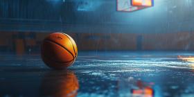 A solitary basketball awaits its next bounce, glistening under the rain-soaked court