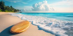 A wooden surfboard awaits the perfect wave on a pristine tropical beach