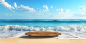 A wooden surfboard awaits the perfect wave on a pristine tropical beach