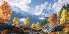 A serene autumnal landscape unfolds, where a winding river meets the majestic snow-capped mountains