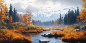 A serene autumnal landscape unfolds, where a winding river meets the majestic snow-capped mountains