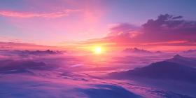 A breathtaking sunrise paints the sky in hues of pink and purple, casting a magical glow over the snow-capped mountains