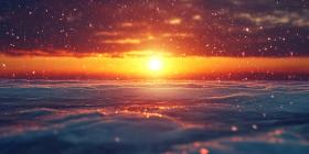 A breathtaking sunrise paints the sky in hues of pink and purple, casting a magical glow over the snow-capped mountains