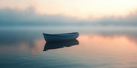 A solitary boat drifts on a tranquil lake shrouded in mist