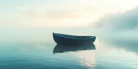 A solitary boat drifts on a tranquil lake shrouded in mist