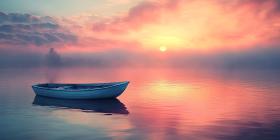 A solitary boat drifts on a tranquil lake shrouded in mist