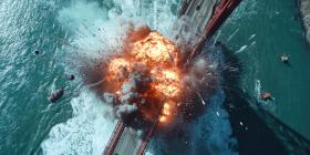 Dramatic Bridge Explosion: Aerial View of Fire and Smoke Engulfing a Metal Bridge, with Debris Scattering into the Disturbed Water Below