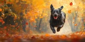 A joyful black dog bounds through a vibrant autumnal forest, leaves swirling around him as he revels in the beauty of the season