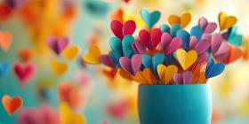 Against a vibrant backdrop of turquoise and sunset hues, a whimsical bouquet of paper hearts, crafted in a rainbow of colors, spills from a terracotta vase