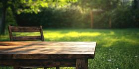 A rustic wooden table and chair beckon amidst a lush green garden, where sunlight filters through the leaves