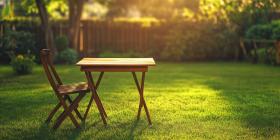 A rustic wooden table and chair beckon amidst a lush green garden, where sunlight filters through the leaves
