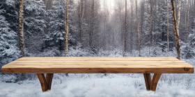 A rustic wooden table sits nestled amidst a breathtaking winter landscape, where snow-laden trees stand tall against a crisp, blue sky