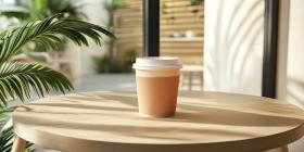 Sunlight streams through a cafe window, casting dappled shadows on a wooden table where a steaming cup of coffee rests, wrapped in a cozy sleeve