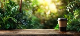 Sunlight streams through a cafe window, casting dappled shadows on a wooden table where a steaming cup of coffee rests, wrapped in a cozy sleeve