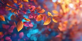 A vibrant tapestry of autumnal hues unfolds as a multitude of leaves, painted in shades of crimson, sapphire, and burnt orange, intertwine and overlap