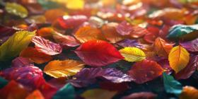 A vibrant tapestry of autumnal hues unfolds as a multitude of leaves, painted in shades of crimson, sapphire, and burnt orange, intertwine and overlap