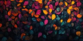 A vibrant tapestry of autumnal hues unfolds as a multitude of leaves, painted in shades of crimson, sapphire, and burnt orange, intertwine and overlap