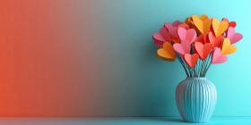 Against a vibrant backdrop of turquoise and sunset hues, a whimsical bouquet of paper hearts, crafted in a rainbow of colors, spills from a terracotta vase
