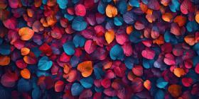 A vibrant tapestry of autumnal hues unfolds as a multitude of leaves, painted in shades of crimson, sapphire, and burnt orange, intertwine and overlap