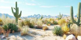 Towering saguaro cacti stand sentinel against a backdrop of rugged mountains, showcasing the resilience of life in the desert landscape