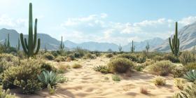 Towering saguaro cacti stand sentinel against a backdrop of rugged mountains, showcasing the resilience of life in the desert landscape