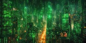 A mesmerizing digital metropolis unfolds, where towering skyscrapers are woven from cascading lines of emerald green code