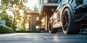 A sleek black SUV gleams in the warm evening light, parked in the driveway of a modern mansion, hinting at a life of comfort and effortless travel