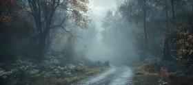 A winding road cuts through a vibrant autumnal forest, where golden leaves blanket the ground and a misty haze hangs in the air