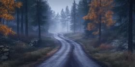 A winding road cuts through a vibrant autumnal forest, where golden leaves blanket the ground and a misty haze hangs in the air