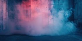 A minimalist room bathed in a surreal glow of blue and pink neon light, with swirling clouds of smoke adding an ethereal touch