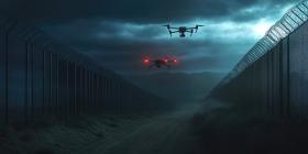 A drone patrols the border, its light cutting through the darkness as it monitors the desolate landscape
