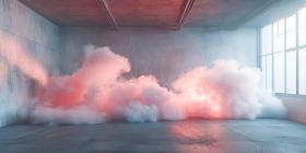 A minimalist room bathed in a surreal glow of blue and pink neon light, with swirling clouds of smoke adding an ethereal touch