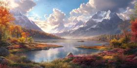 A tranquil lake nestled amidst a breathtaking panorama of towering mountains and dramatic cloudscapes, inviting a sense of peace and wonder