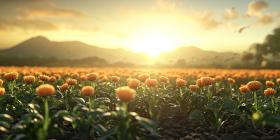 A golden sunset bathes a field of blooming marigolds in its warm glow