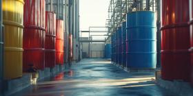 A colorful symphony of barrels lines the industrial corridor, reflecting the vibrant hues of industry