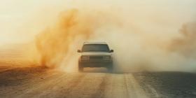 Alone vehicle braves the dusty desert road, leaving a trail of adventure