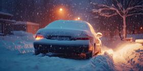 A sleek car navigates the snowy mountain pass, leaving a trail of winter magic