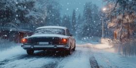 A sleek car navigates the snowy mountain pass, leaving a trail of winter magic