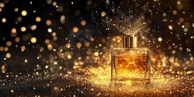 A luxurious perfume bottle, bathed in a warm golden light, evokes a sense of opulence and sophistication