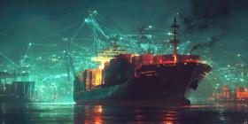 A digital tapestry of global trade, with a cargo ship as the centerpiece