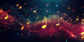 A vibrant explosion of musical notes dances through a swirling nebula of energy, capturing the essence of rhythm and harmony