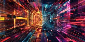 A kaleidoscopic journey through a digital universe, where vibrant hues of red, orange, and blue converge in a mesmerizing symphony of light and data