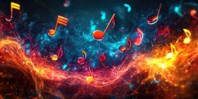 A vibrant explosion of musical notes dances through a swirling nebula of energy, capturing the essence of rhythm and harmony
